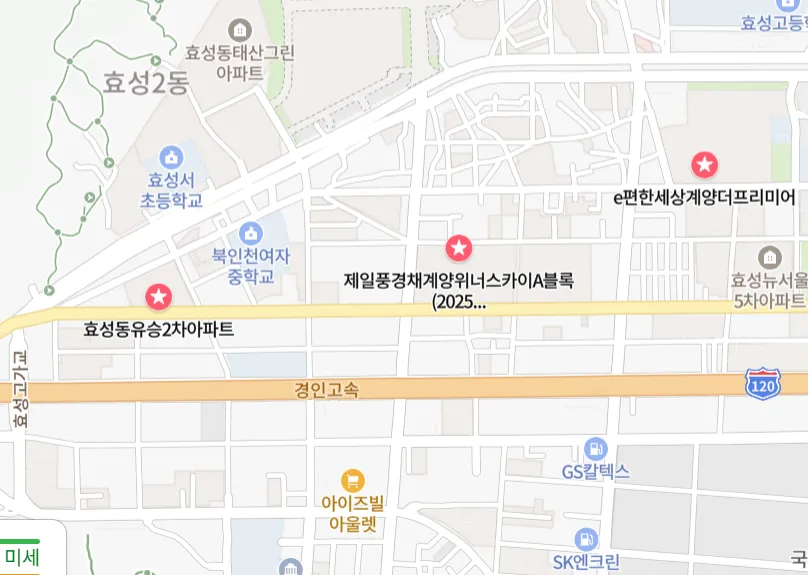 효성동의 대장아파트는 e편한세상계양더프리미어 로 봤습니다. 최근 매매가는 5억 3300만원, 전세는 3억 3000만원입니다.